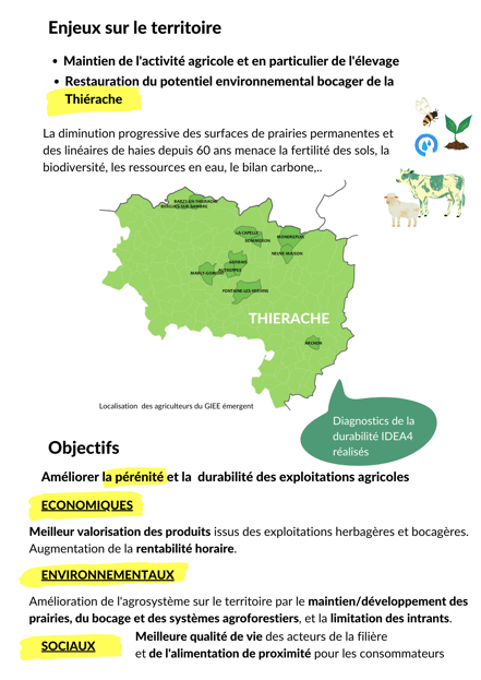 Notre GIEE - Groupement d’Intérêt Economique et Environnemental - regroupe des agriculteurs notamment les éleveurs, le PETR (Pôle d’Equilibre Territorial et Rural) de Thiérache, le PNR (Parc Naturel Régional) de l’Avesnois, AgroParisTech, l’INRAe et les autres partenaires (Initiatives Paysannes, Réseau CIVAM, Paturesens, Patur’ajust, …) autour d’un projet commun orienté vers un mode de production plus durable des exploitations herbagères et bocagères afin de mener à bien une transition écologique sur le territoire.